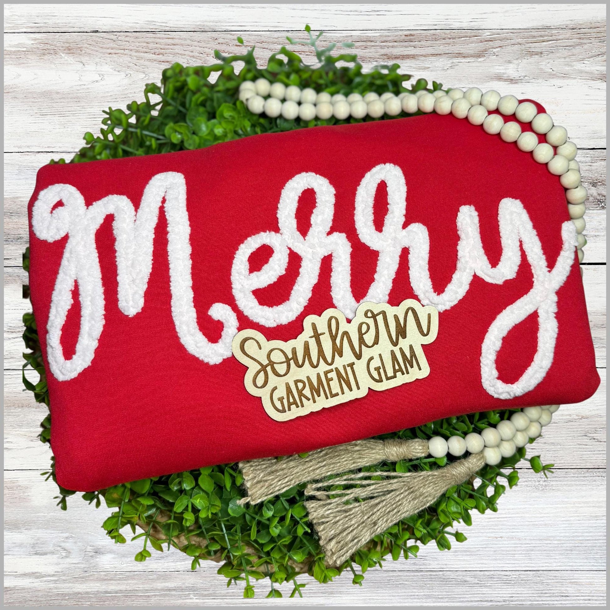 Add a cozy touch and school spirit to your wardrobe with this beautiful Merry Sweatshirt embroidered with chenille yarn!